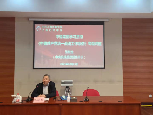 為深入推進中智集團統(tǒng)戰(zhàn)工作,切實發(fā)揮好統(tǒng)戰(zhàn)人士在新時代履行新使命中的重要作用,2021年10月26日,中智集團在中共上海市委黨校(上海行政學院)舉辦《中國共產(chǎn)黨統(tǒng)一戰(zhàn)線工作條例》專題學習班,中央統(tǒng)戰(zhàn)部原副秘書長、干部局局長、研究室主任、新聞發(fā)言人張獻生作專題輔導解讀。集團統(tǒng)戰(zhàn)干部和部分統(tǒng)戰(zhàn)代表人士參加學習班。
