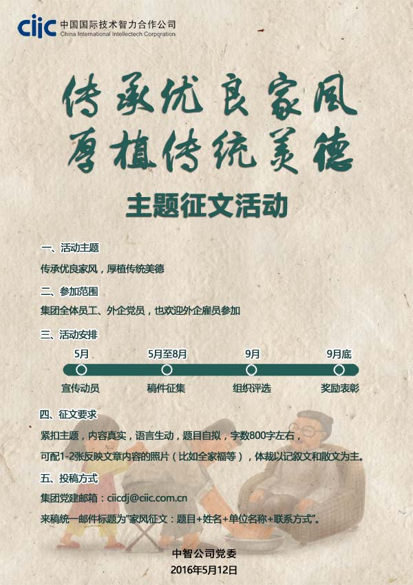 集團(tuán)黨建郵箱:ciicdj@ciic.com.cn;來稿統(tǒng)一郵件標(biāo)題為“家風(fēng)征文:題目+姓名+單位名稱+聯(lián)系方式”。